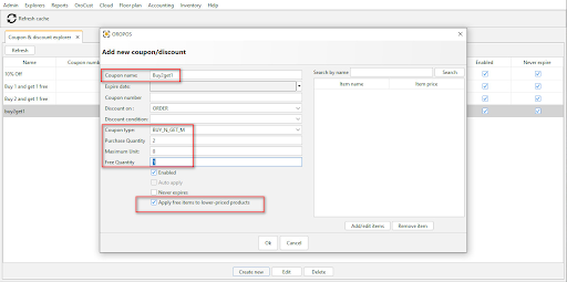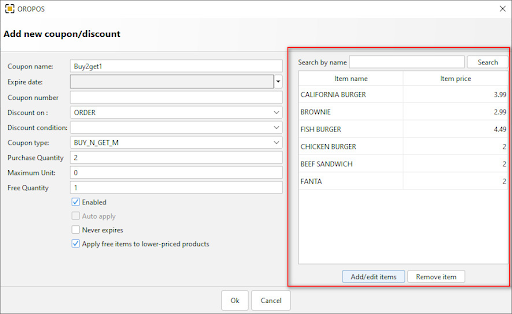 The Coupon and discount form has added a new order type discount named BUY_N_GET_M, where you can add any quantity of items (including modifiers) and set any number of items as a discount.